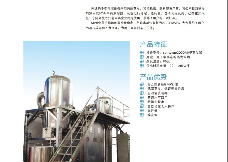 由深圳市瑞升华科技有限公司联合德国PILLER公司研发和生产的第三代MVR中药浓缩蒸发装置经过近一年的试运行和客户的带料运行,设备运行稳定,蒸发量及由深圳市瑞升华科技有限公司联合德国PILLER公司研发和生产的第三代MVR中药浓缩蒸发装置经过近一年的试运行和客户的带料运行,设备运行稳定,蒸发量及单位能耗均达到设计要求,在客户的使用过程中得到用户的好评。由于该产品自动化程度高,蒸发水量稳定,每吨水单位能耗为23-25KWH,大大节约了用户的运行成本和人力资源,为用户真正创造了价值。